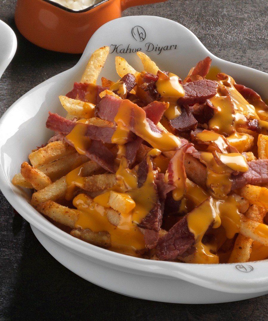 BAHARATLI PATATES KIZARTMASI ÜZERİNDE CHEDDAR SOS,