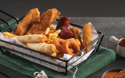 ÇITIR PİLİÇ, MOZARELLA STICK, SİGARA BÖREĞİ, SOĞAN HALKASI, GURME DANA SOSİS, BAHARATLI PATATES KIZARTMASI YANINDA RANCH SOS, TATLI EKŞİ SOS |