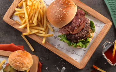 BURGER KÖFTESİ, FÜME ET, CHEDDAR PEYNİRİ, KARAMELİZE SOĞAN, DİP SOS, MEXICAN SEBZE KARIŞIMI, ÇUBUK TURŞU, KITIR SOĞAN YANINDA BAHARATLI PATATES KIZARTMASI, RANCH SOS |