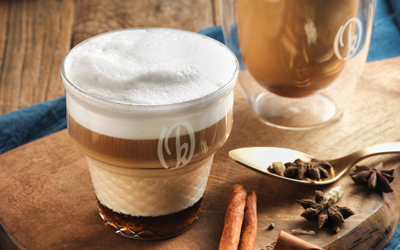 Espresso, süt, süt kreması, bal kabağı sos, tatlı krema, tarçın