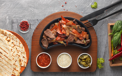 DANA BONFİLE DİLİMLERİ, SOTELENMİŞ SEBZELER, DOMATES SOS, RANCH SOS, JALAPENO BİBER TURŞUSU, TORTİLLA EKMEĞİ |