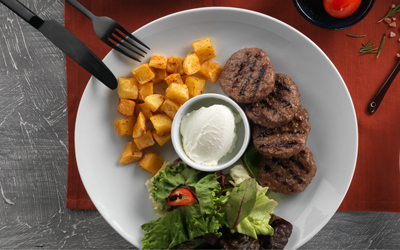 IZGARA KÖFTE, PATATES, YOĞURT, MEVSİM YEŞİLLİKLERİ