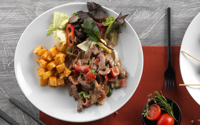 DANA BONFİLE DİLİMLERİ, İKİ RENK BİBER, MANTAR, KREMALI MANTAR SOS, PATATES, MEVSİM YEŞİLLİKLERİ |