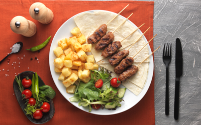 ŞİŞ KÖFTE, TORTİLLA EKMEĞİ, PATATES, MEVSİM YEŞİLLİKLERİ
