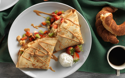 KREP HAMURU KATLARI ARASINDA MEVSİMİNDE TAZE MEYVELER ÜZERİNDE FISTIK EZMESİ SOS VE YANINDA KREM ŞANTİ |