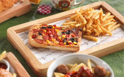 KEKİKLİ DOMATES SOSU, MISIR, ZEYTİN, YEŞİL BİBER, KIRMIZI BİBER,SALAM, SOSİS, PATATES KIZARTMASI |