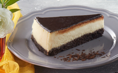 Brownie kek üzerinde özel cheesecake kreması, bitter çikolata ganaj