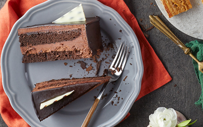 Kakaolu kek katları arasında yoğun çikolata krema ve üzerinde çikolata sosu