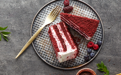 Vişneli kek katları arasında özel krema, orman meyveleri