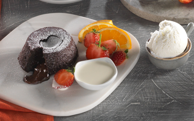 Yoğun çikolata ile hazırlanmış sıcak lezzet, krema, taze mevsim meyveleri