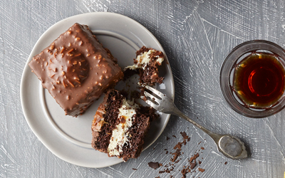 Kakaolu kek katları arasında vanilyalı krema, yer fıstıklı karamel üzerinde çikolata sosu