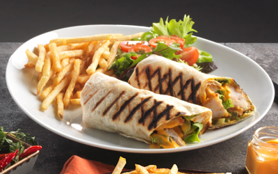 TORTILLA EKMEĞİNE SARILMIŞ ACI SOSLU ÇITIR TAVUK PARÇALARI YANINDA BAHARATLI PATATES KIZARTMASI, MEVSİM YEŞİLLİLERİ |