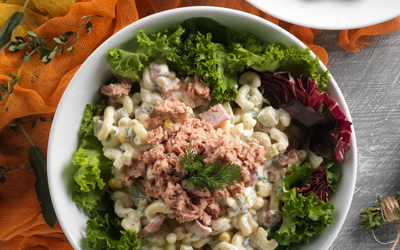 KARIŞIK MEVSİM YEŞİLLİKLERİ ÜZERİNDE MAYONEZLİ YOĞURT SOSLU DİRSEK MAKARNA, KÖZLENMİŞ KIRMIZI BİBER, MISIR, SALATALIK TURŞUSU, DEREOTU VE TON BALIĞI |