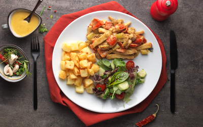 PİLİÇ PİRZOLA DİLİMLERİ, RENKLİ BİBERLER, MANTARLAR, KREMALI MANTAR SOS, PATATES, MEVSİM YEŞİLLİKLERİ |